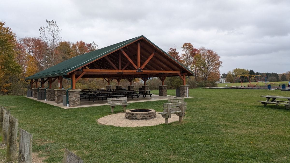 The pavilion is huge with over a dozen picnic tables under cover. Next to it is a nice firepit with hard-scaping and a couple benches for those cool nights when you want a fire to keep you warm or just to roast marshmallows over. The pavilion can be reserved through the Auburn Township website by downloading and completing a form.