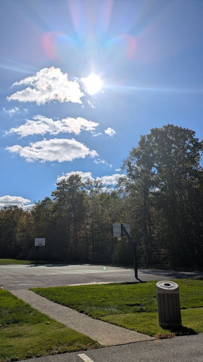 The basketball court hidden behind the pavilion.